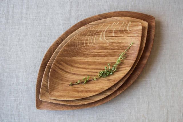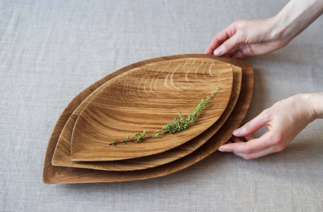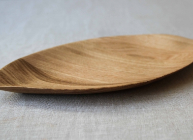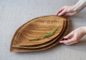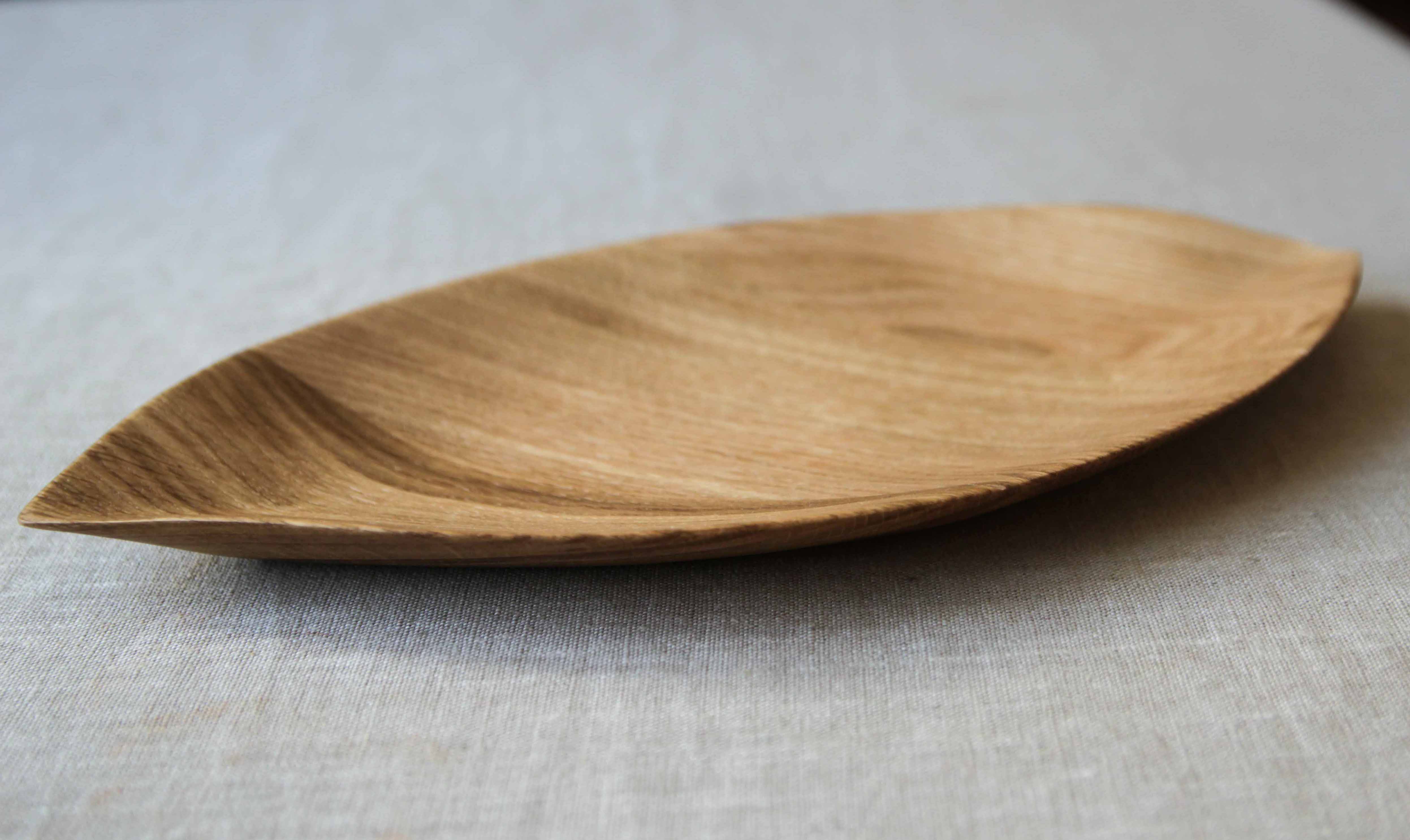 Изящное тонкое блюдо для сервировки Лист - вытянутой формы с острыми и утонченными краями. Пропитка мастикой из льняного масла и пчелиного воска. Подберите размер поменьше