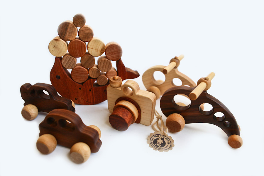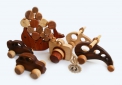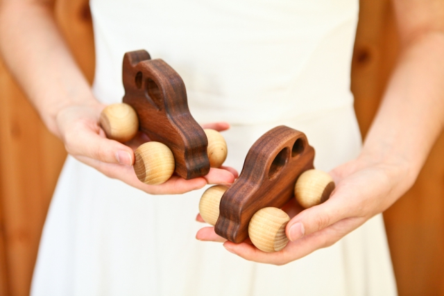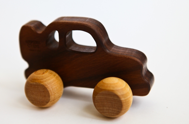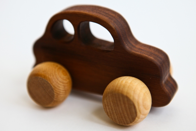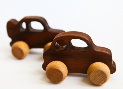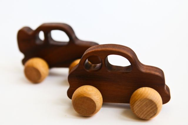 Две модели автомобилей из ореха: семейное авто и джип. Колесики из клена. Дети с легкостью и крепко держат в руке такие игрушки, размеры и прорези, расположение колес - все эргономичное и продуманное. В семейной мастерской в Калифорнии эти игрушки в первую очередь делают для своих детей, а потом уже на продажу.