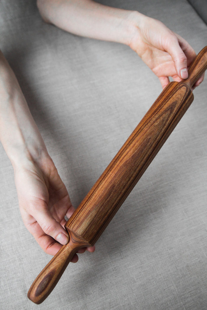 Большая деревянная скалка из черешни, покрыта льняным маслом. Слегка текстура поверхность, красивейший рисунок дерева, приятное ощущение веса в руке и лаконичная форма.